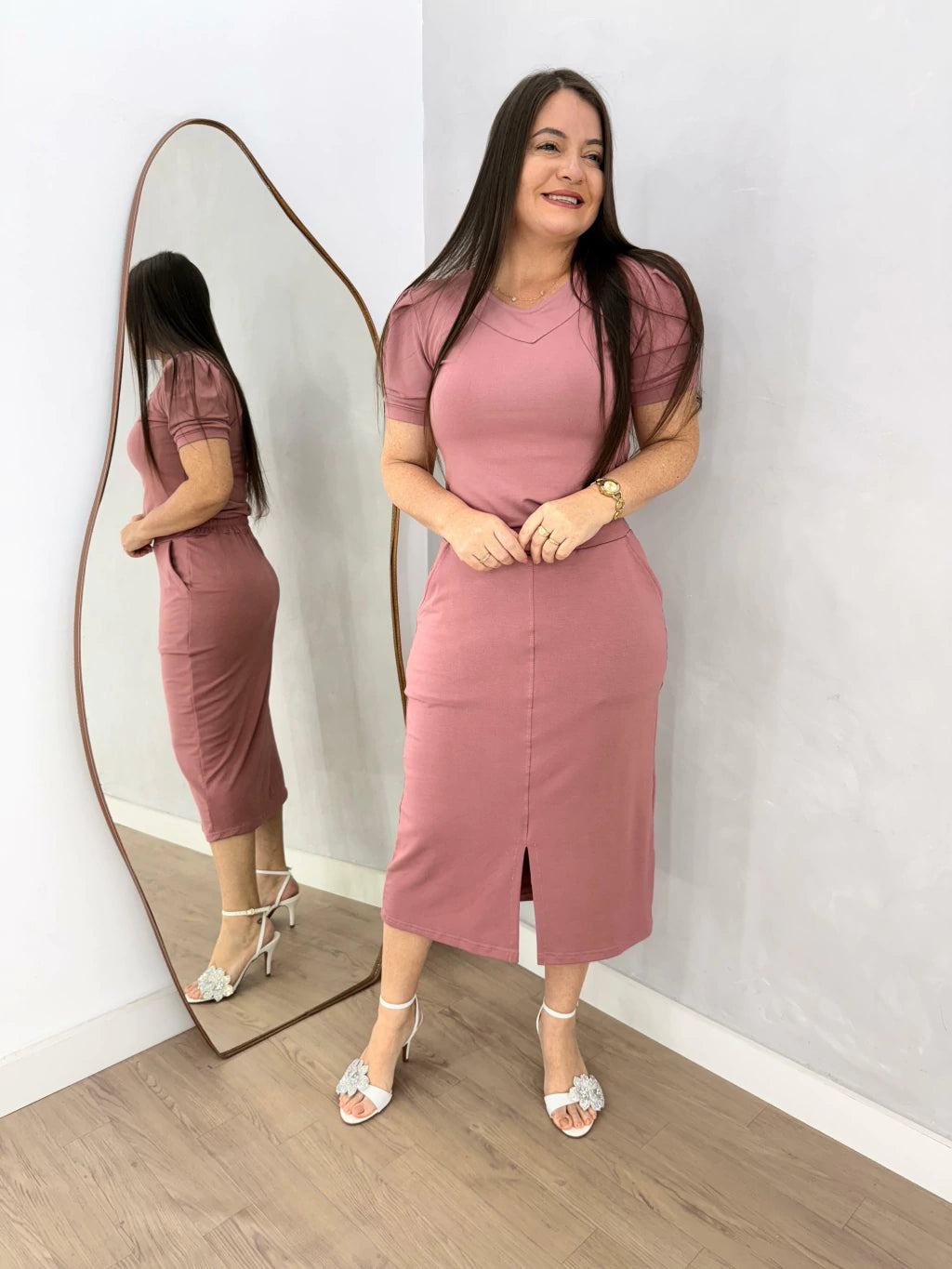 A saia possui elástico na cintura somente atrás, comprimento midi, bolsos laterais e fenda na frontal
