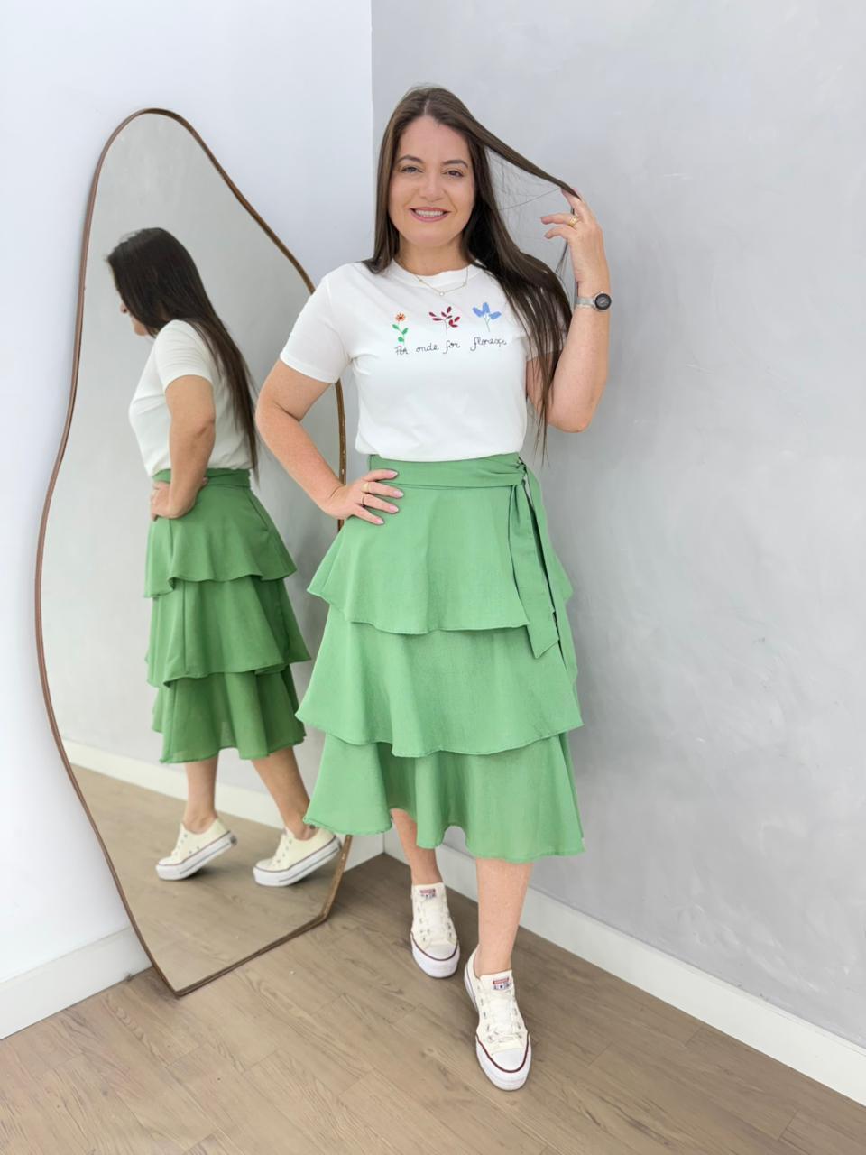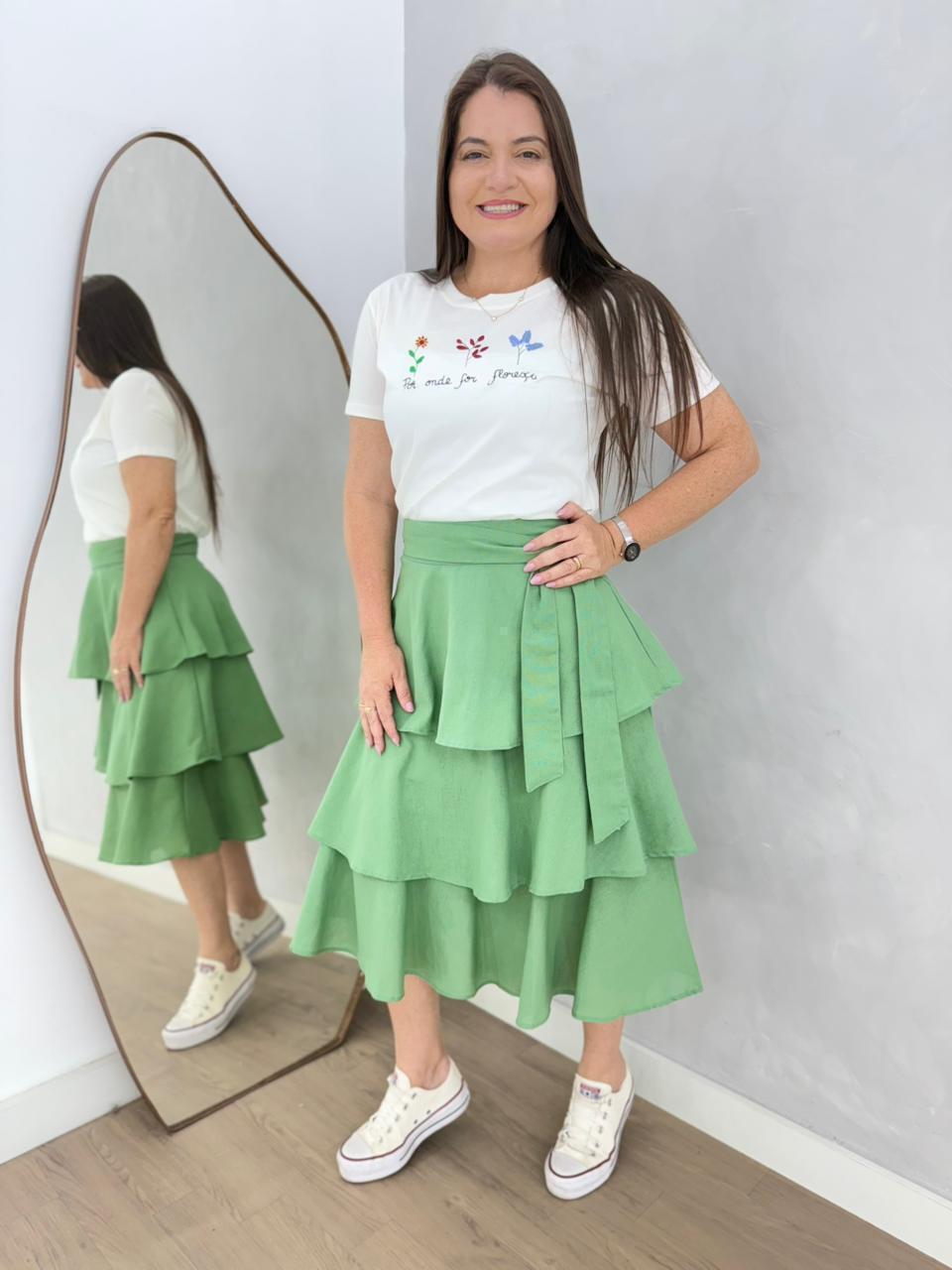 A saia Simone é a personificação da elegância e sofisticação, midi, perfeita para mulheres que buscam um vizual refinado e impecável. Com detalhes delicadamente elaborados, e Marias com babado, fechamento em zíper atrás, com um toque de glamour e requinte a qualquer ocasião especial. Com um corte impecável e caimento perfeito, esta saia é a escolha ideal para quem deseja se destacar com classe e bom gosto