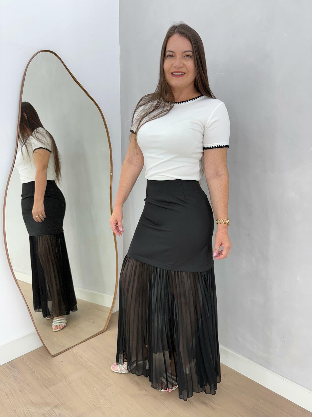 A saia Tais é a personificação da elegância e sofisticação, perfeita para mulheres que buscam um vizual refinado e impecável. Seu design exclusivo combina a leveza com detalhes delicadamente elaborados, conferindo um toque de glamour e requinte a qualquer ocasião especial. Com um corte impecável e caimento perfeito, esta saia é a escolha ideal para quem deseja se destacar com classe e bom gosto.